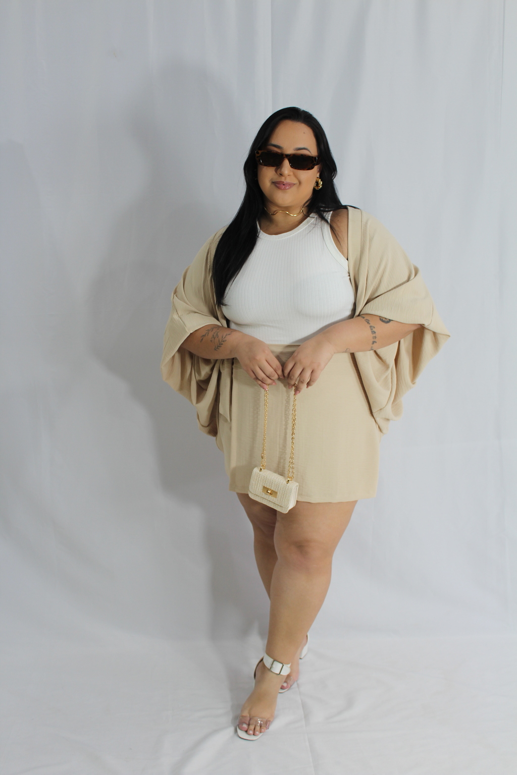 Conjunto Fernanda composto por um short saia e cardigã moderno com elástico nas suas mangas e caindo impecável, trazendo uma leveza, sofisticação e conforto, tecido duna.
